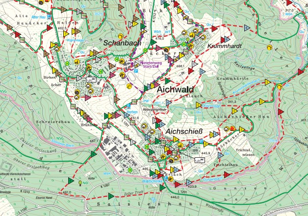 5, 6, 7, 8, 17 | Schanbach "Kreisverkehr" (10 Min., ca. 800 m) Aichschieß "Kreuzung" (15 Min., ca. 1 km) |
