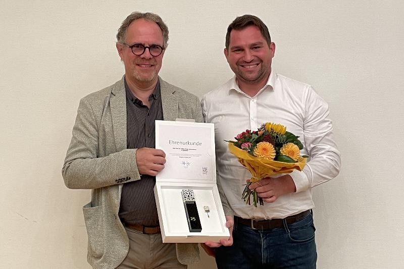 Vom Gemeindetag Baden-Württemberg werden an Kommunalpolitiker, die langjährig ehrenamtlich tätig sind, Ehrennadeln und Stelen verliehen. Als „besonders verdienter und langjähriger Gemeinderat“ wurde Prof. Dr. Volker Haug von BM Jarolim für sein 25-jähriges kommunalpolitisches Engagement ausgezeichnet: Im Oktober 1999 erstmals gewählt, war Haug als nunmehr dienstältester Gemeinderat Aichwalds nahezu durchgängig im Verwaltungsausschuss aktiv und hatte 15 Jahre die Position des 1. stellvertretenden Bürgermeisters inne. Nach dem Wechsel von BM Nicolas Fink in den Stuttgarter Landtag hatte Haug bis zur Wahl von Andreas Jarolim fünf Monate kommisarisch das Amt des Bürgermeisters inne. Seit 22 Jahren führt Haug den Vorsitz der CDU-Fraktion im Gemeinderat.