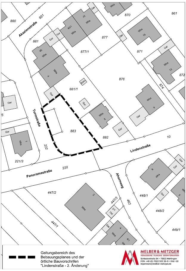 - im Osten durch die bebauten Grundstücke Turmstraße 4, Flst. Nr. 881/1 und Lindenstraße 5, Flurstück Nr. 882,