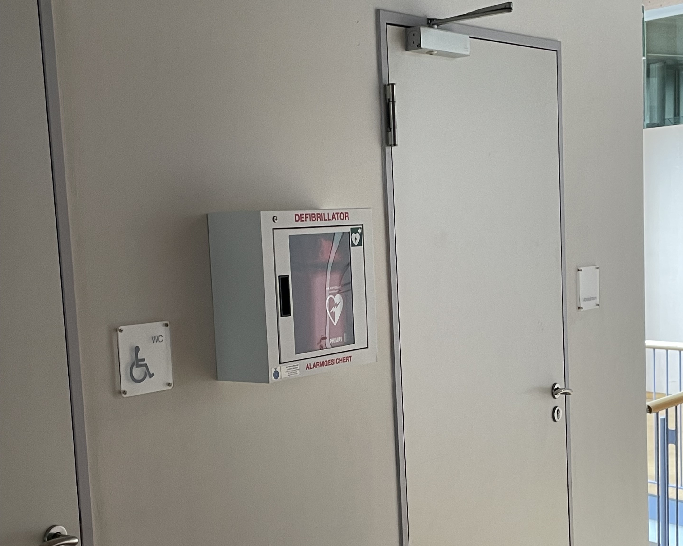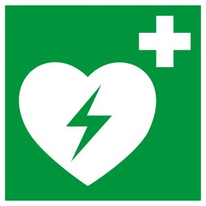Die Standorte der Defibrillatoren sind durch ein international einheitliches AED-Piktogramm gekennzeichnet:Ein grünes Schild mit einem weißen Herz und einem Blitzsymbol sowie teilweise mit der Aufschrift „AED“.