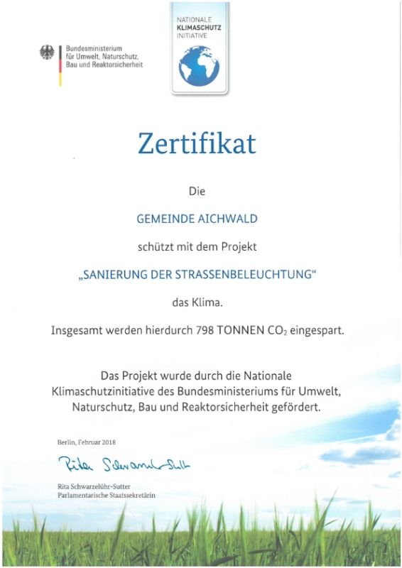 Im Rahmen der Fördermaßnahme des Bundesministeriums für Umwelt, Naturschutz, Bau und Reaktorsicherheit (BMU) hat die Gemeinde Aichwald einen Zuschuss für den Austausch der teilweise über 30 Jahre alten Straßenleuchten gegen moderne und intelligente LED Außenleuchten beantragt. Im ausgeschriebenen Förderbereich „Klimaschutz bei der LED- Außen- und Straßenbeleuchtung sowie bei LED- Lichtsignalanlagen“ werden 20% der zuwendungsfähigen Ausgaben vom Bund übernommen, wenn die CO2-Emissionen um mindestens 70% gegenüber dem Ist-Zustand gemindert werden können.