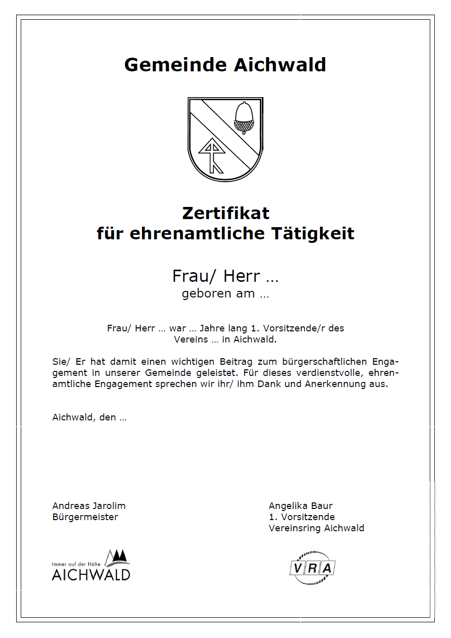 Das Ehrenamtszertifikat der Gemeinde Aichwald